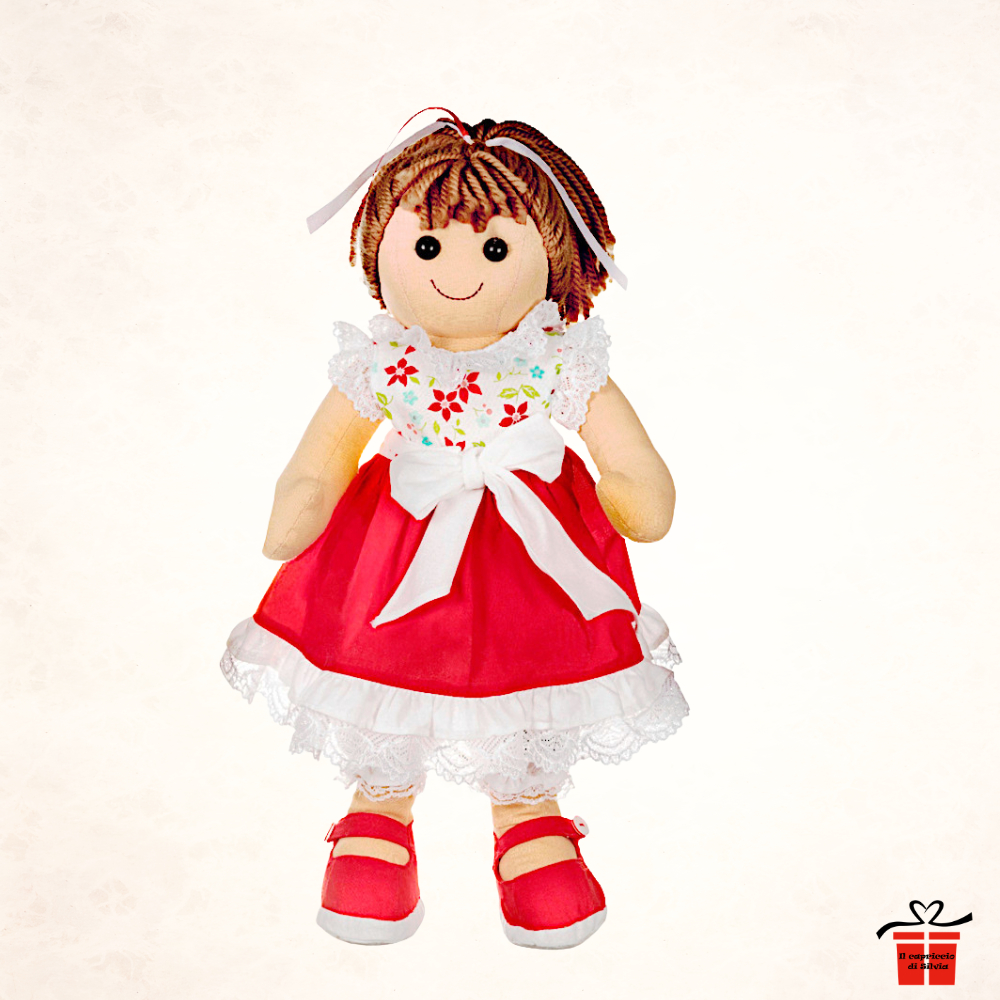 La dolcezza intramontabile di una compagna d'infanzia fatta con amore, perfetta come preziosa collezione o come tenera idea regalo. Alessandra, con il suo vestitino rosso e i dettagli in pizzo, scalda il cuore di grandi e piccini.