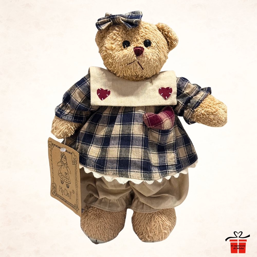 Questa dolcissima orsetta di peluche trasmette tutta la nostalgia e il calore dei giochi artigianali. Indossa una graziosa salopette a quadretti blu e panna, arricchita da un grande colletto con cuoricini rossi applicati e un fiocco coordinato sulla testa, dettagli che la rendono una splendida idea regalo per ogni occasione. Realizzata con materiali di alta qualità, è un pezzo unico da aggiungere alla tua collezione My Doll per arredare con tenerezza i tuoi spazi.