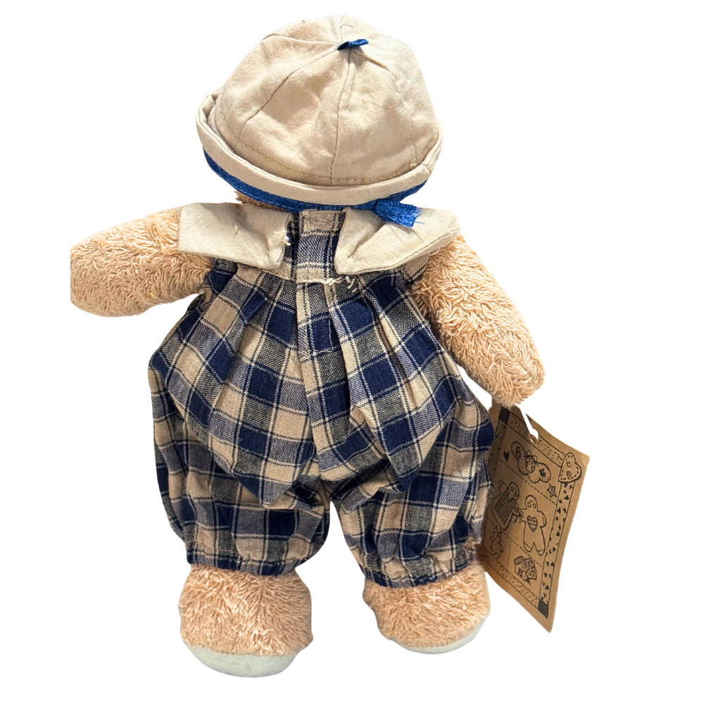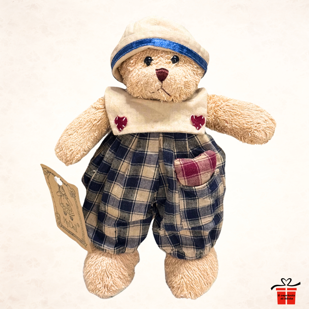 Questo adorabile orsetto dal sapore vintage è pronto a portare un tocco di dolcezza in ogni casa. Indossa un completo curato nei minimi dettagli con pantaloni a quadretti blu e panna, un colletto beige con cuoricini rossi e un cappellino coordinato, caratteristiche che lo rendono una perfetta idea regalo per chi ama gli oggetti fatti con amore. Morbido e rifinito a mano, è un pezzo imperdibile per arricchire la tua collezione di peluche My Doll dal fascino intramontabile.