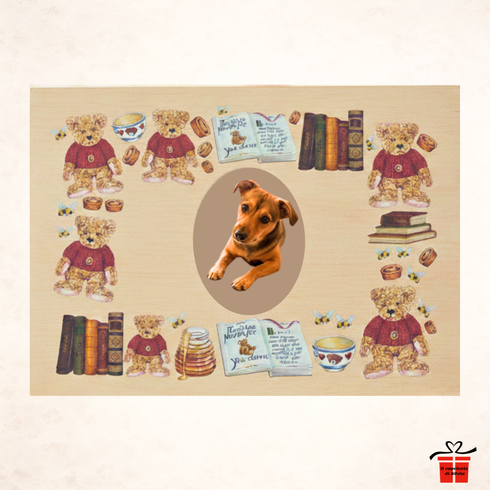 L'Elaborazione al PC: Ho preso una foto speciale di Jhonny Weiss e l'ho lavorata al computer. Ho creato digitalmente uno sfondo che si sposasse perfettamente con i colori della tavoletta e degli orsetti. Solo una volta ottenuto il risultato perfetto l'ho stampata. Questo mi ha permesso di avere un'immagine già "ambientata" e pronta per essere incorniciata dalla carta.