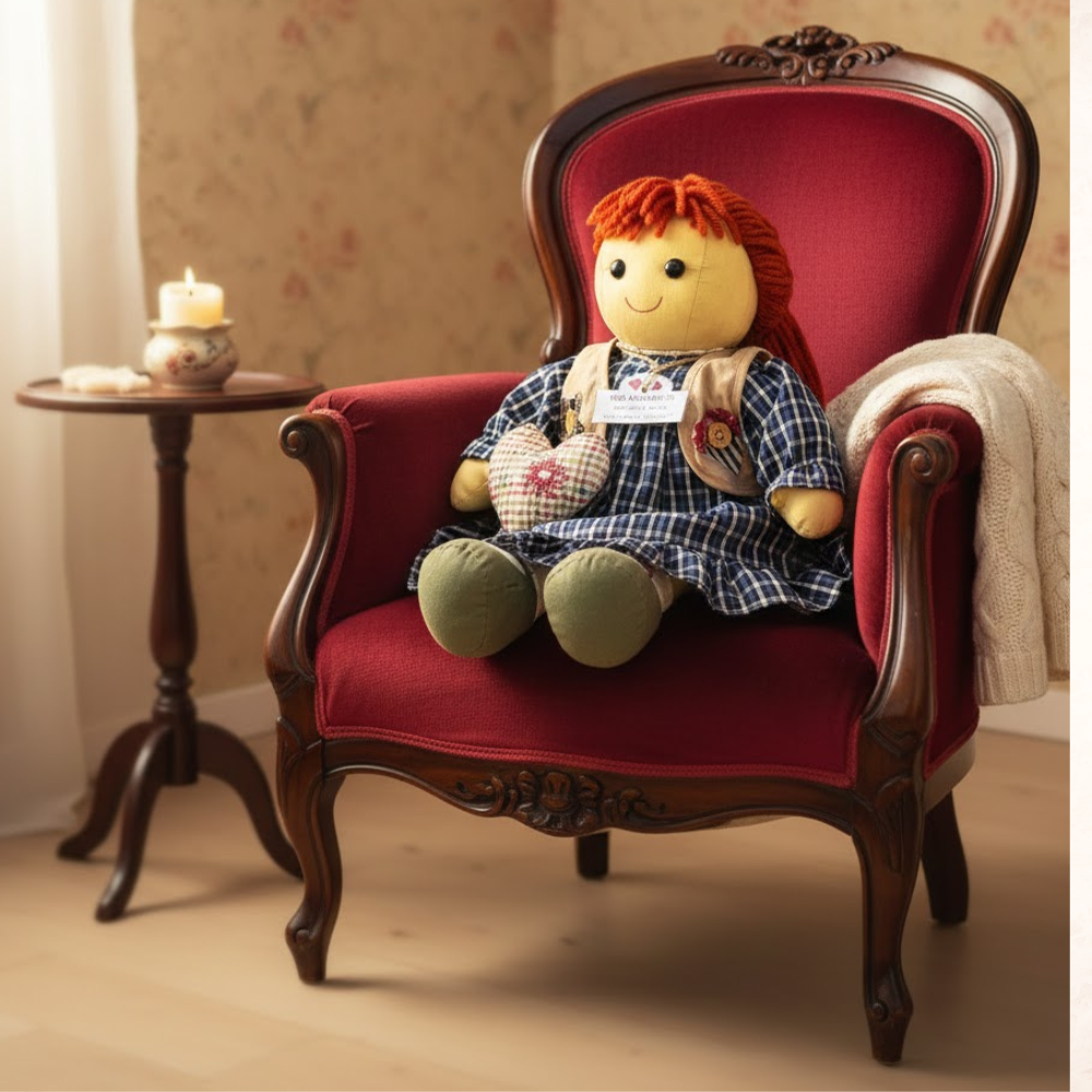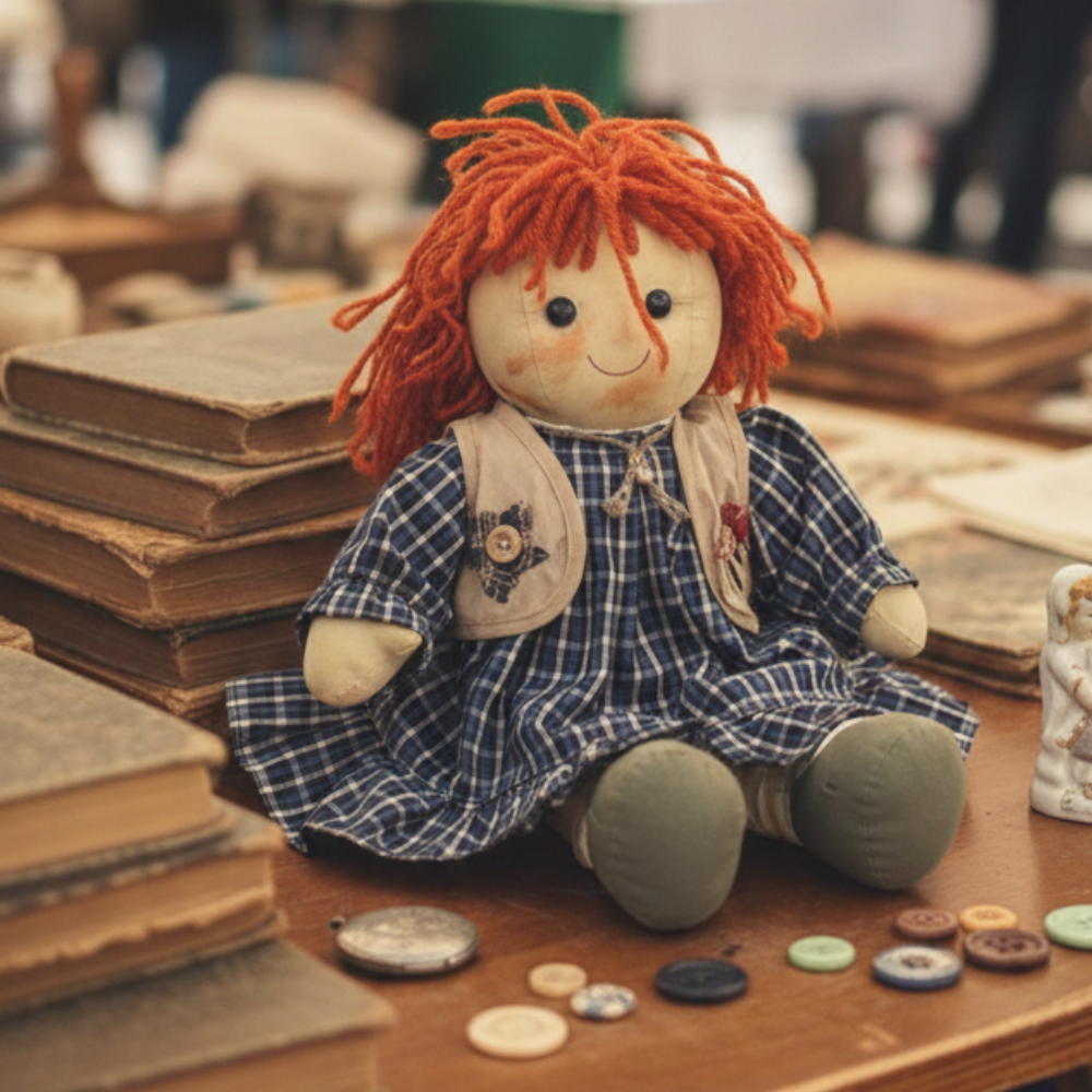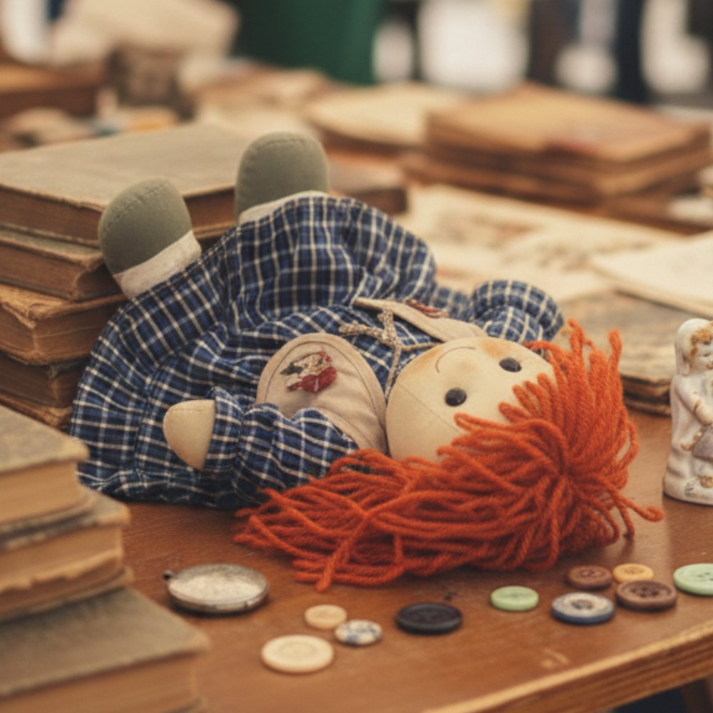 Mentre giravamo tra i banchi, l'ho notata subito. Era sdraiata su un tavolo di legno, quasi gettata lì senza cura tra vecchi libri e bottoni polverosi. Aveva i capelli di lana rossa tutti arruffati e lo sguardo perso nel vuoto. Mi sono fermata un istante, colpita dalla sua espressione dolce nonostante la trascuratezza, ma poi ho proseguito il giro con Jhonny.