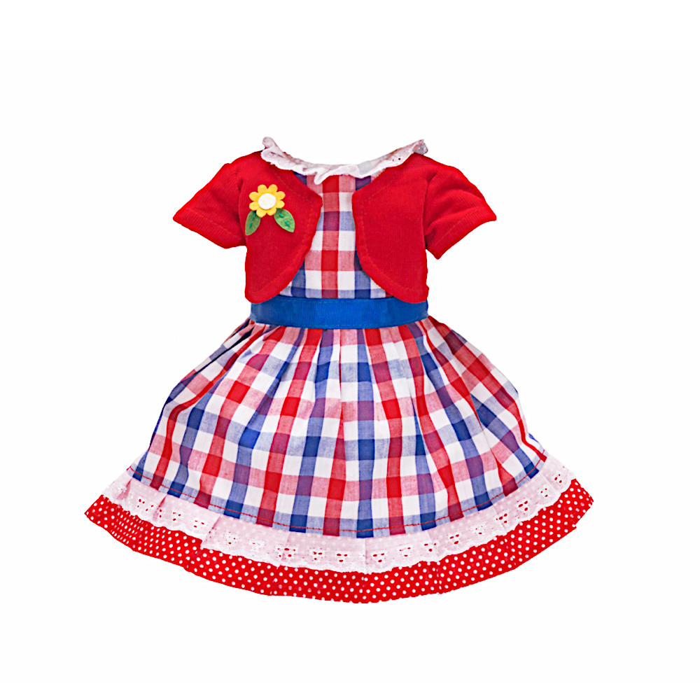 Il vestito della bambola è a scacchi blu, bianchi e rossi con una cintura di raso blu sulla vita e una trina bianca con stoffa rossa a pois sul fondo della gonna.