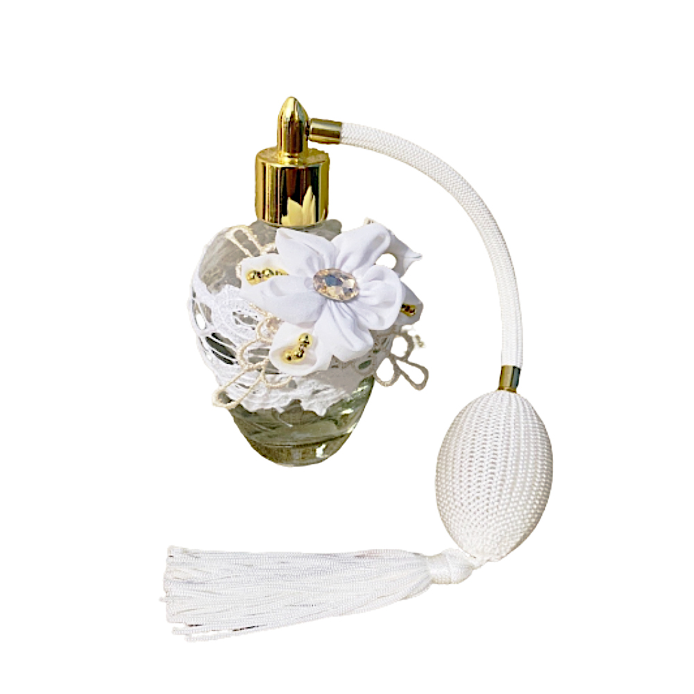 Spruzzatore vintage a pompetta in vetro per vaporizzare i vostri profumi in modo perfetto con fiore bianco, merletti, perle e pizzo, stile shabby chic, per le amanti del retrò.