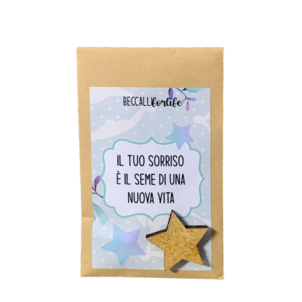 Bustina di semi mix fiori di campo con frase emozionale per bimbo "Il tuo sorriso è il seme di una nuova vita" e piccola stella in legno.