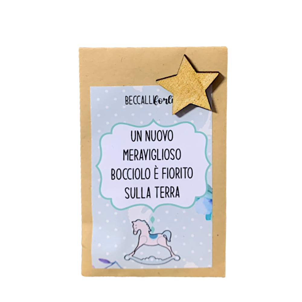 Bustina di semi mix fiori di campo con frase emozionale per bimbo "Un meraviglioso bocciolo è fiorito sulla terra" e piccola stella in legno.