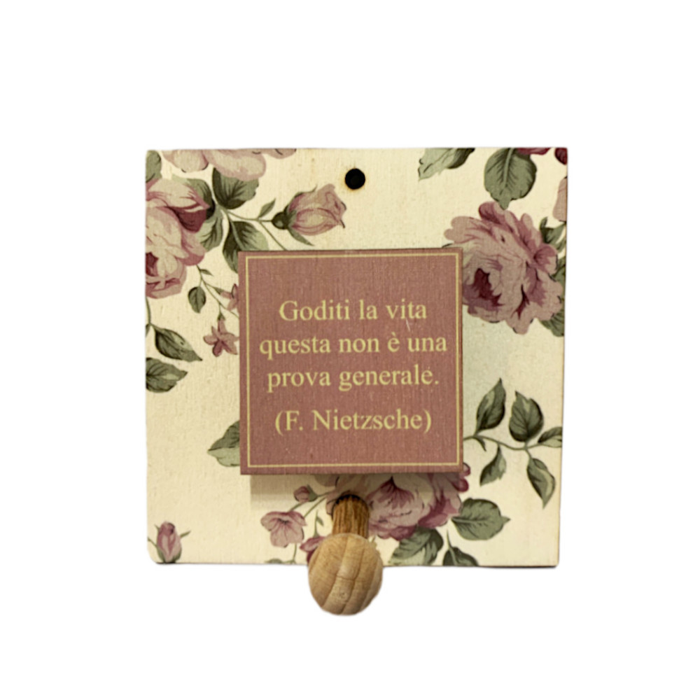 Bellissimo quadretto portachiavi da parete con ganci per appendere le vostre chiavi, in legno, con frase di F. Nietzsche: "Goditi la vita questa non è una prova generale".