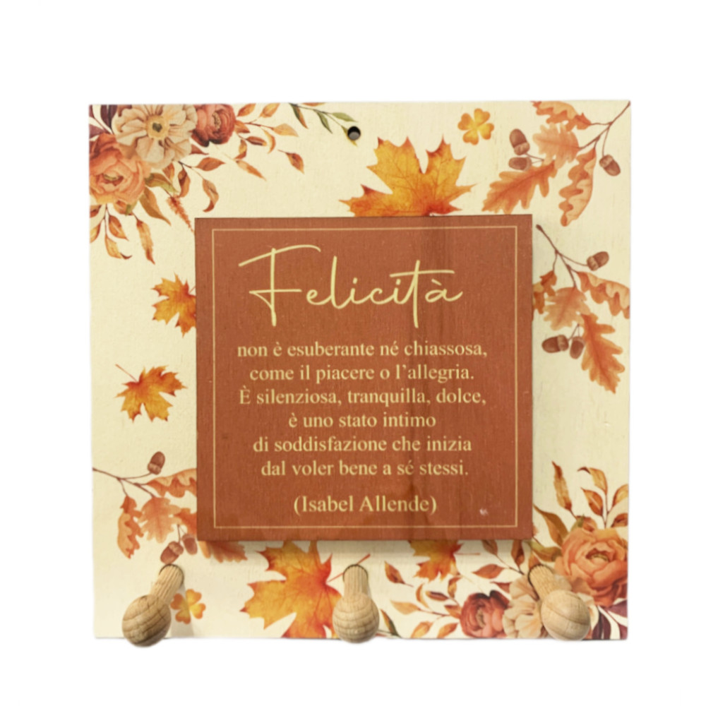 Bellissimo quadretto portachiavi da parete con ganci per appendere le vostre chiavi, in legno, con frase di Isabel Allende sulla felicità: "Non è esuberante nè chiassosa, come il piacere o l'allegria. E' silenziosa, tranquilla, dolce, è uno stato intimo di soddisfazione che inizia dal voler bene a sè stessi".