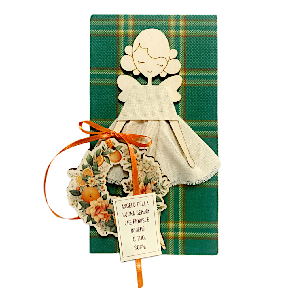 Bellissimo quadretto in legno da parete con l' Angelo della Prosperità, con tessuto tartan e frase "Angelo della buona semina che fiorisce insieme ai tuoi sogni".