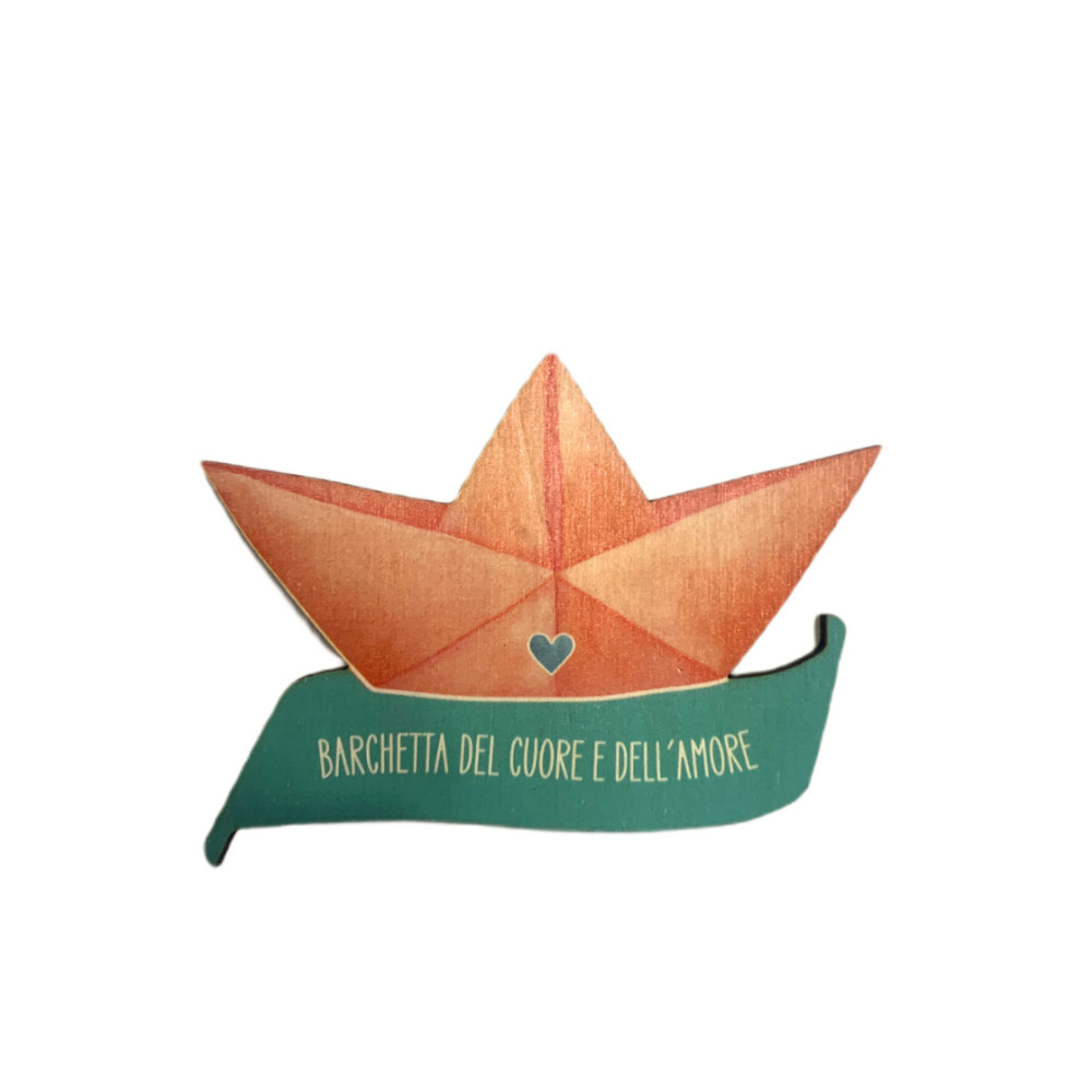 Calamita decorativa in legno a forma di barchetta a righe in legno della linea Mare con frase "Barchetta del cuore e dell' amore".