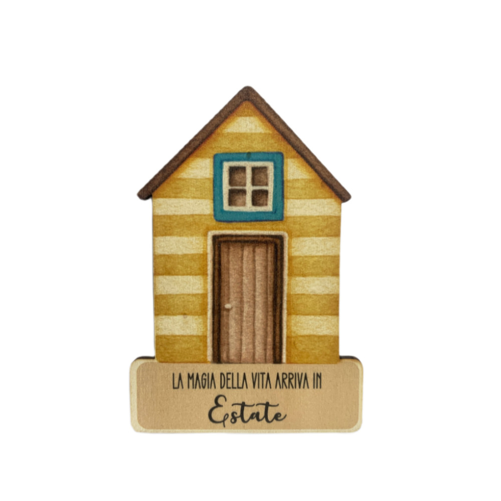 Calamita decorativa in legno a forma di casetta azzurra in legno della linea Mare con frase "La magia della vita arriva in estate".