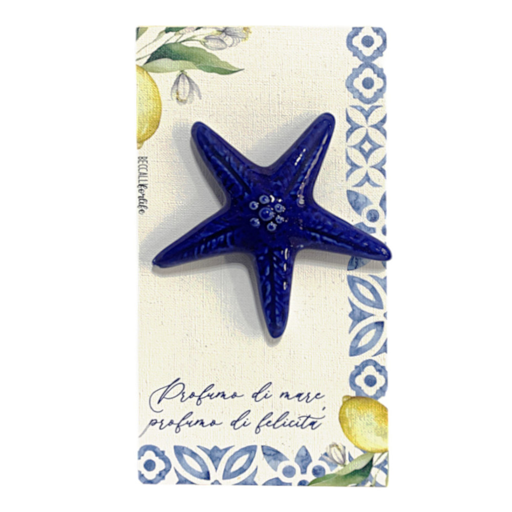 Bellissimo quadretto in legno da parete con stella marina blu, a tema mare, in ceramica di Caltagirone e frase "Profumo di mare, profumo di felicità".