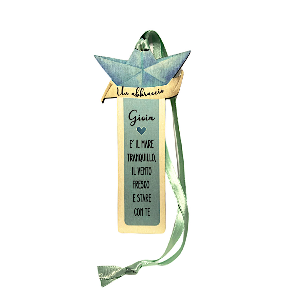 Segnalibro in legno a forma di barchetta blu, a tema mare, con nastro e frase "Un abbraccio Gioia è il mare tranquillo. Il vento fresco e stare con te".
