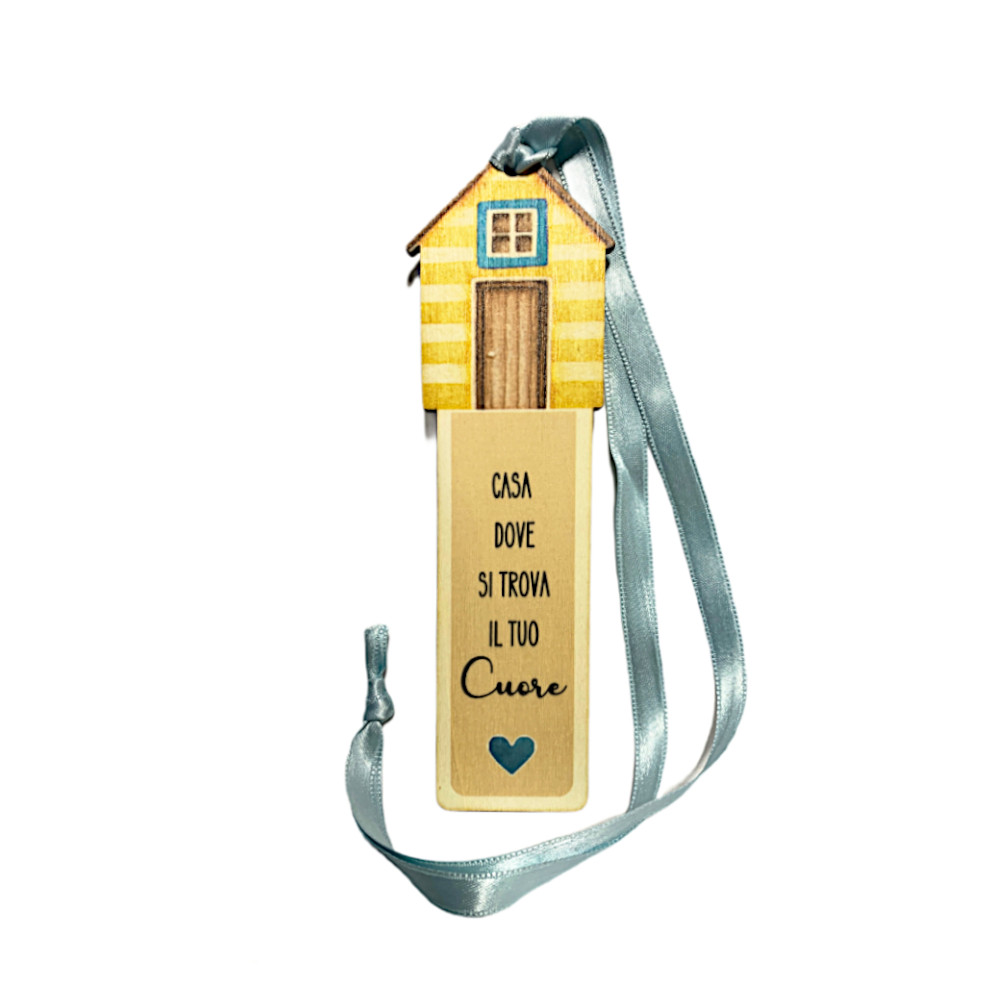 Segnalibro in legno a forma di casetta azzurra, a tema mare, con nastro e frase "Casa dove si trova il tuo cuore".
