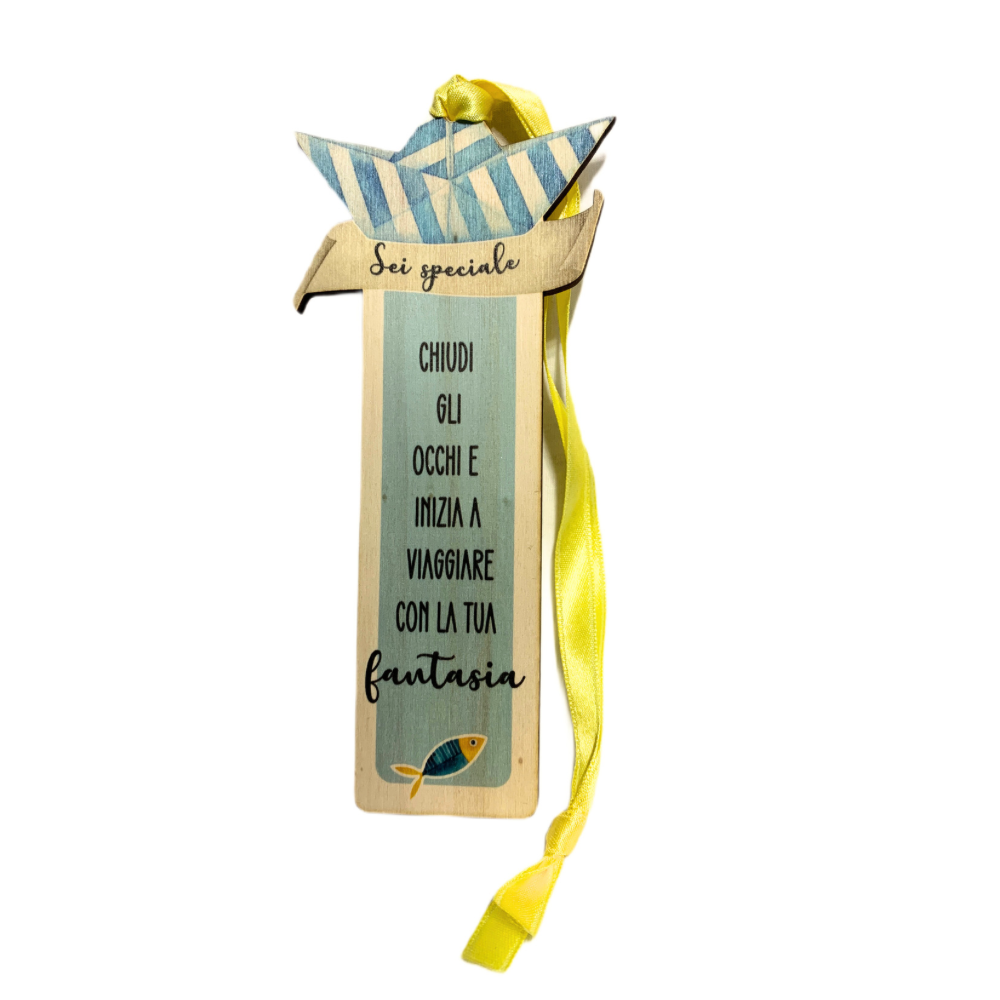 Segnalibro in legno a forma di barchetta bianca e blu a tema mare, con nastro e frase "Chiudi gli occhi e inizia a viaggiare con la tua fantasia".