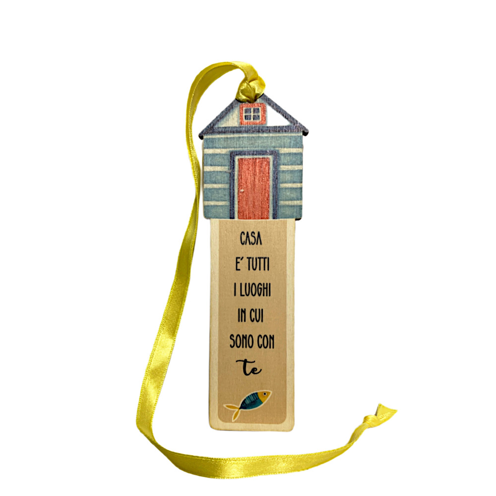 Segnalibro in legno a forma di casetta azzurra, a tema mare, con nastro e frase "Casa è tutti i luoghi in cui sono con te".