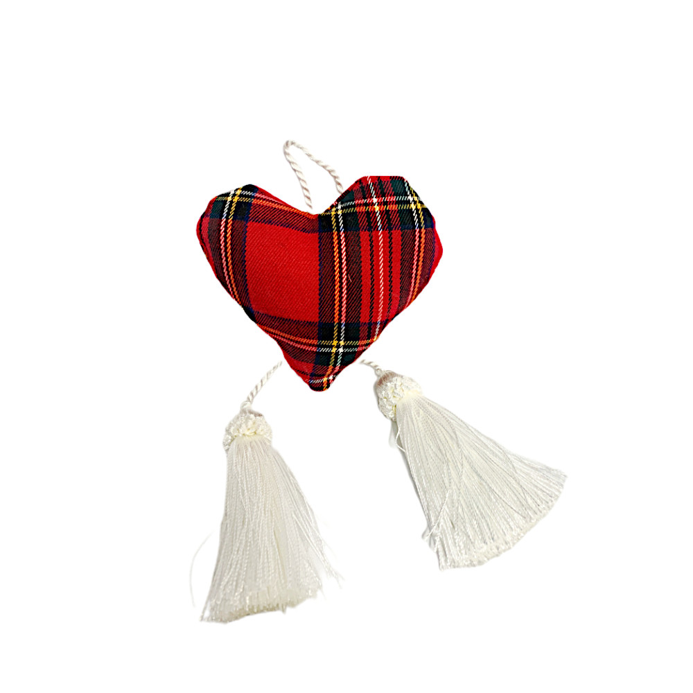 Bellissimo fermatenda in stoffa con cuore rosso a quadri, in tessuto tartan, arricchito da nappine bianche e cordoncino.