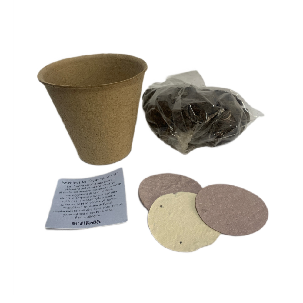 Contiene un vasetto compostabile, terriccio e 3 tag (di vari colori, a seconda della disponibilità) in carta vita, una carta ottenuta dal recupero creativo di carta da macero, rilavorata a mano con aggiunta di semi di fiori, che una volta messa a bagno può essere piantata facendo così germogliare una piantina ed infine un biglietto con spiegazione del procedimento! I fiorellini che cresceranno saranno quelli tutti colorati di campo