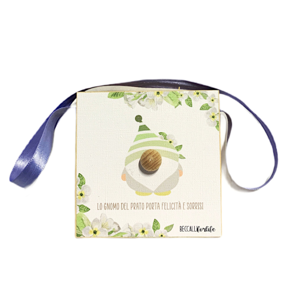 Bellissimo quadretto da appendere con lo Gnomo del  prato e frase "Lo gnomo del prato porta felicità e sorrisi!".