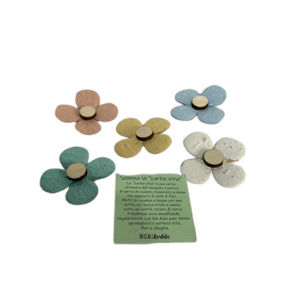 Ma cos'è la carta vita? É una carta ottenuta dal recupero creativo di carta da macero, rilavorata a mano con aggiunta di semi di fiori, che una volta messa a bagno può essere piantata facendo così germogliare una piantina! I fiorellini che cresceranno saranno quelli tutti colorati di campo.