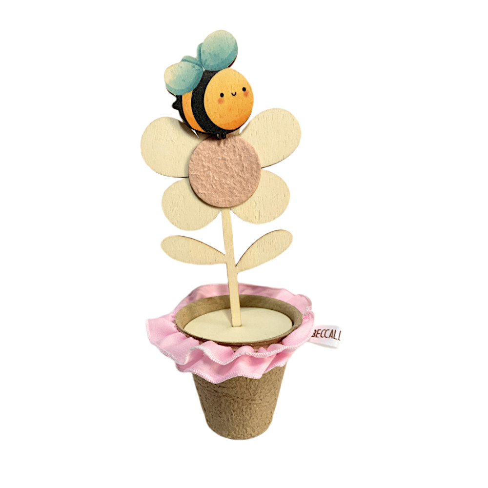 Vasetto compostabile bordato da un nastro arricciato, con margherita rosa antico in legno decorata da un'ape.