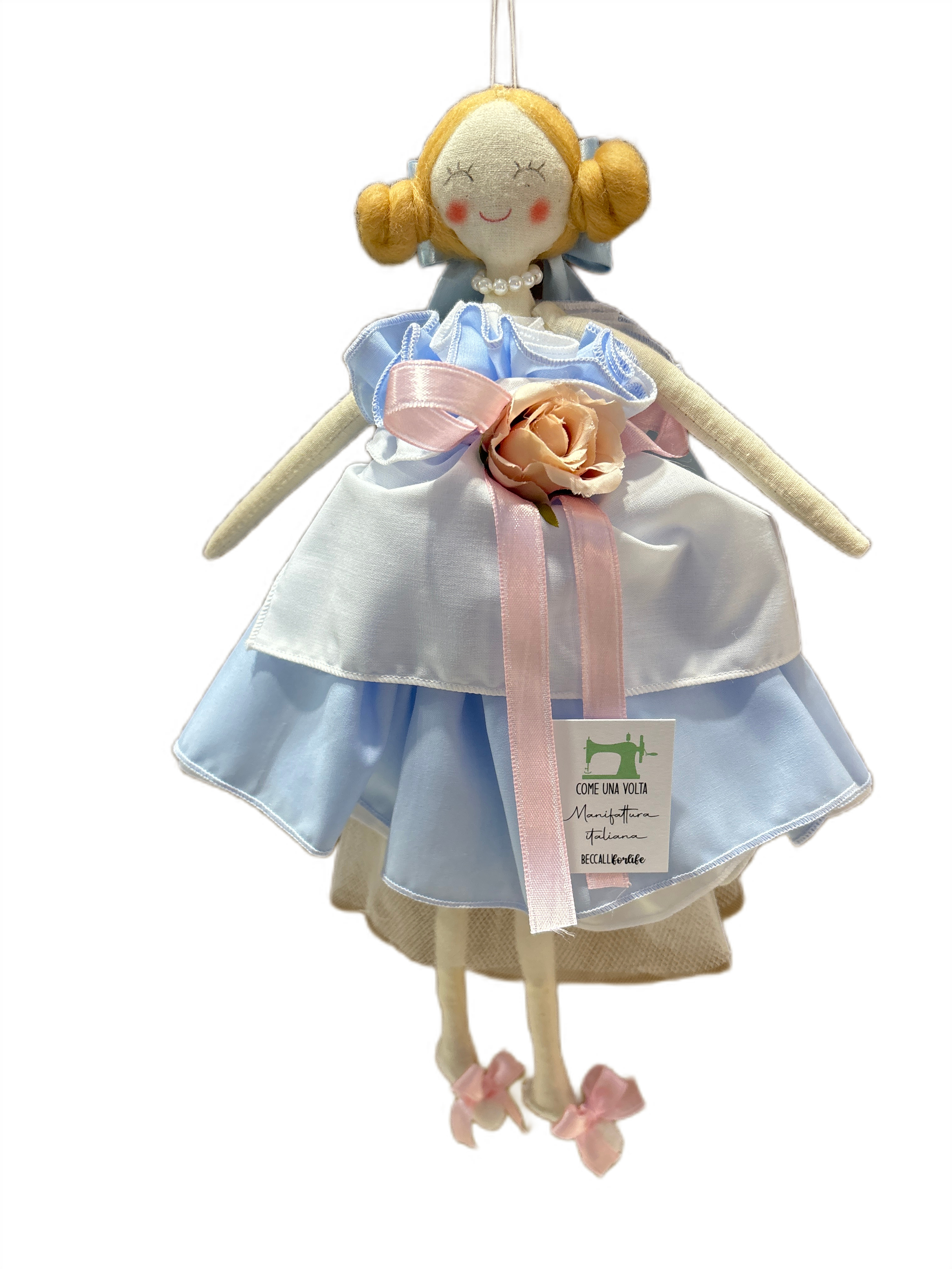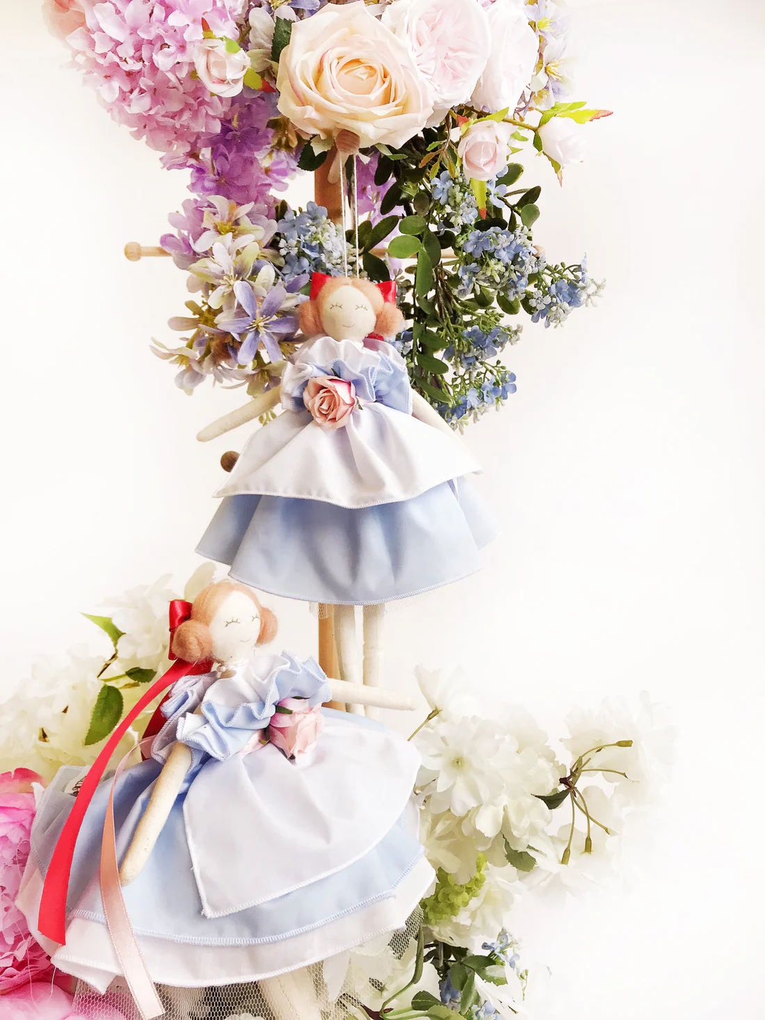 Bambola decorativa da appendere, di pezza, della fiaba di Alice nel Paese delle Meraviglie con indosso un vestitino azzurro ed una sottanina in organza, arricchita da nastrini e rosellina. Completa di targhetta "Come una volta, manifattura italiana".