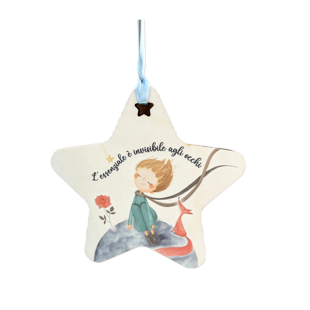 Bellissima stella in legno con il Piccolo Principe e la volpe.