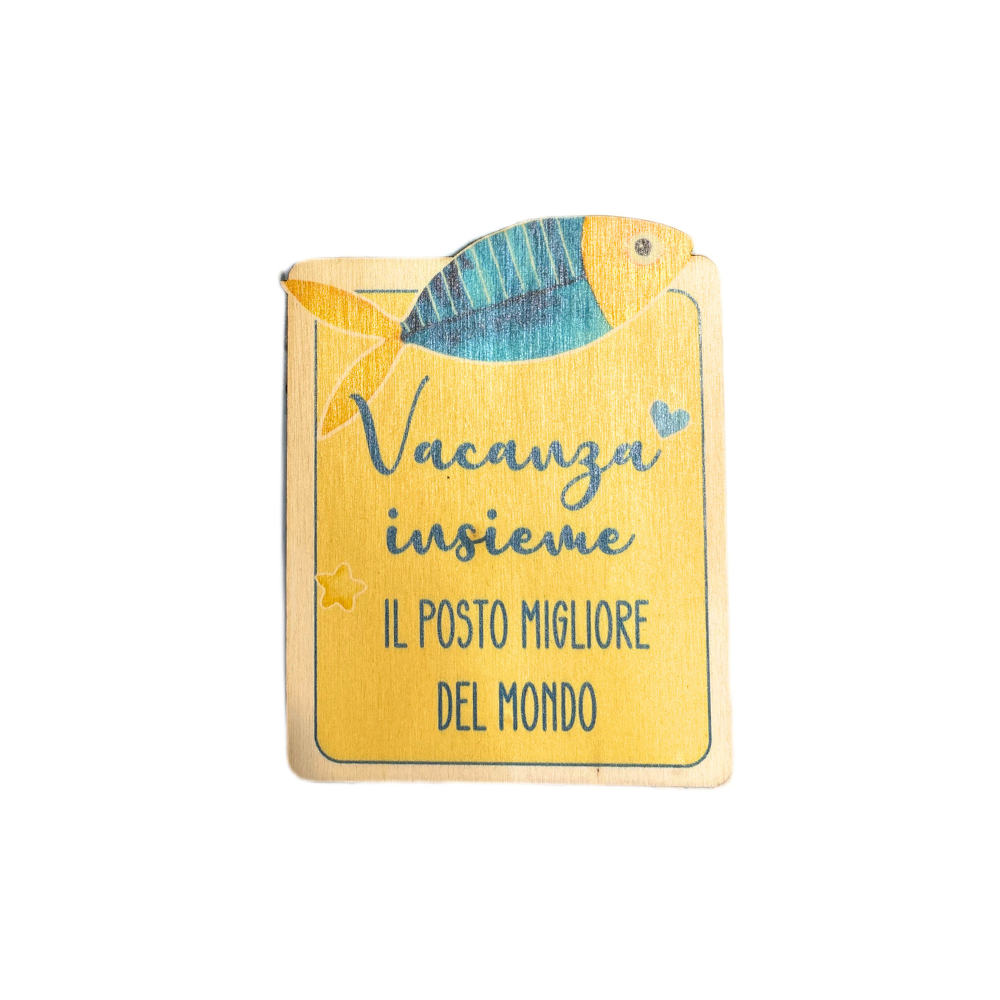 Calamita decorativa in legno a forma di targhetta blu con pesci in legno della linea mare con frase "Vacanza insieme il posto migliore del mondo".