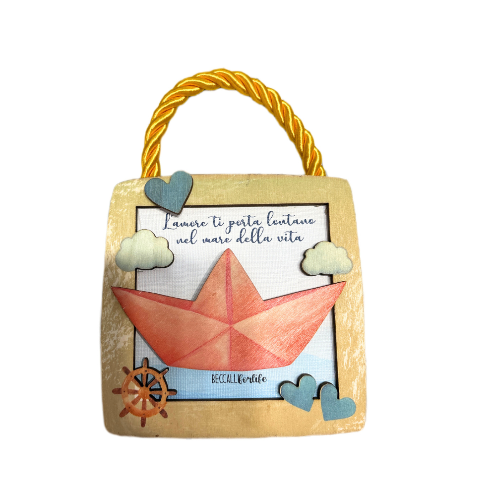 Bellissimo quadretto in legno da parete, a tema mare, con barchetta e frase "L'amore ti porta lontano nel mare della vita", con cordone senape.