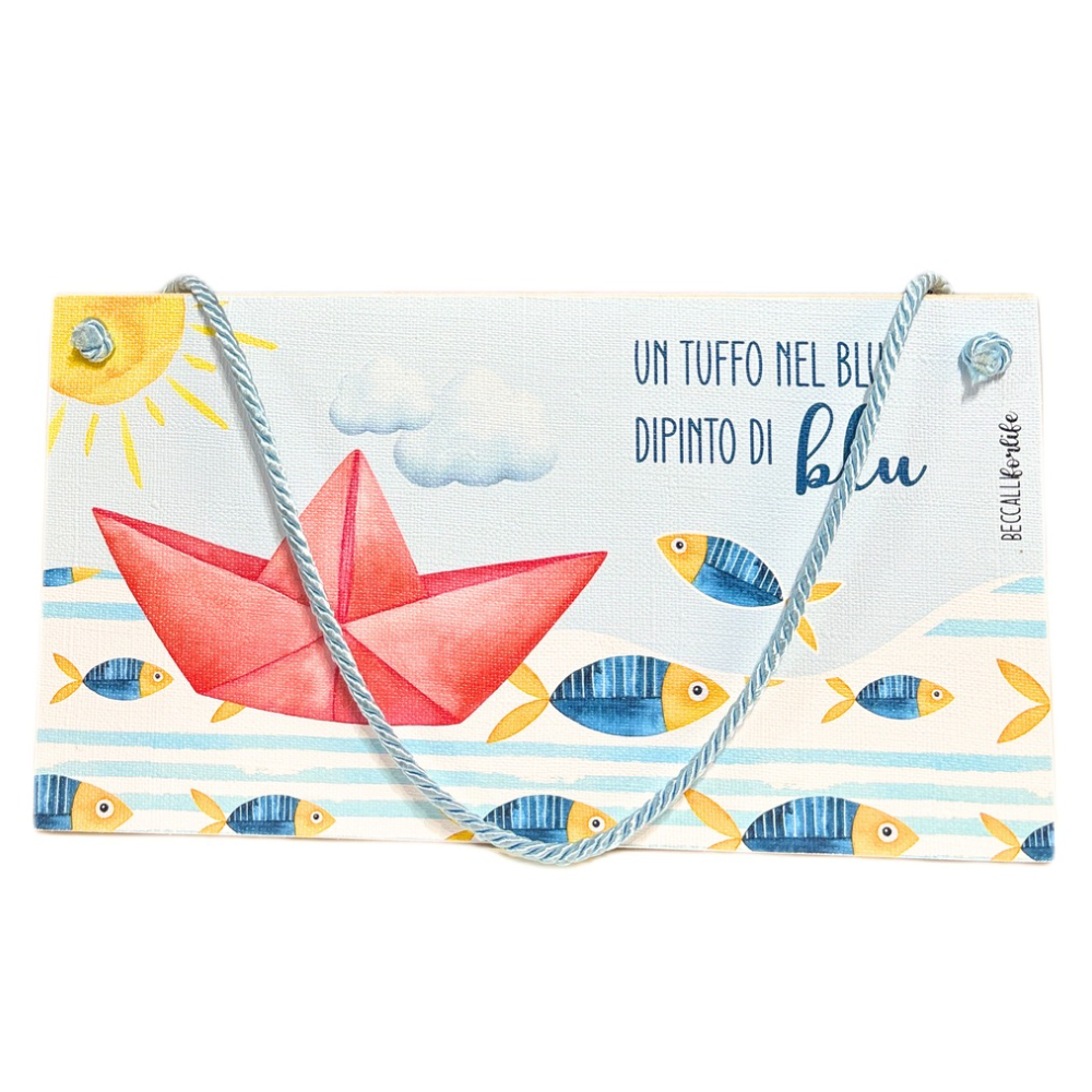 Bellissimo quadretto cartolina in legno da parete, a tema mare, con raffigurata una barchetta e frase "Un tuffo nel blu dipinto di blu", con cordone senape.