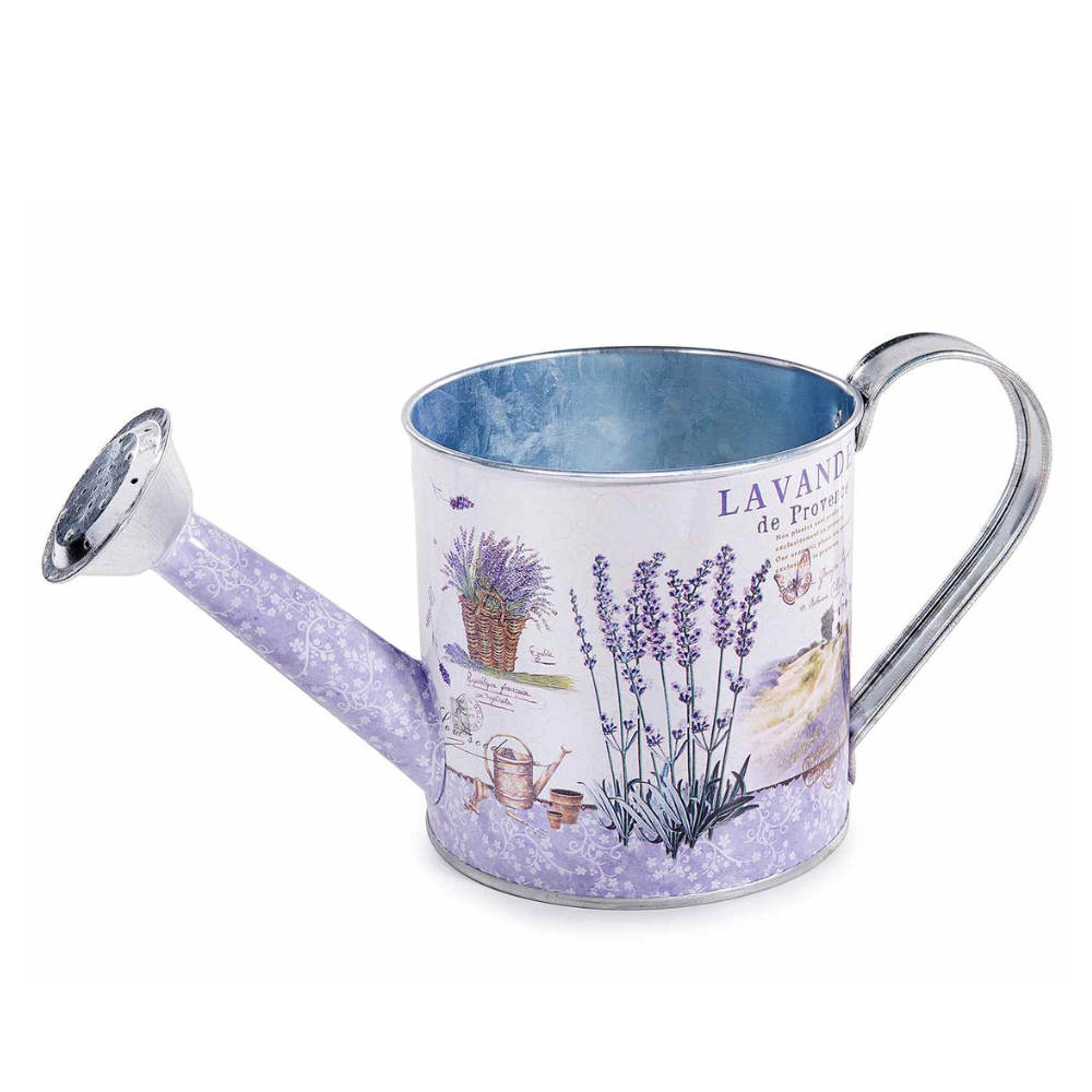 Bellissimo vaso a forma di innaffiatoio in metallo, design a 360° e decorazioni con la lavanda.