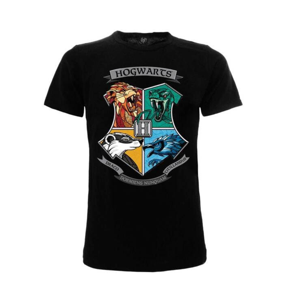 Maglietta nera da donna con lo stemma del logo di Hogwarts della saga di Harry Potter.