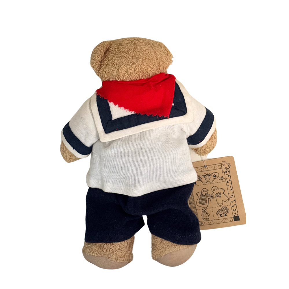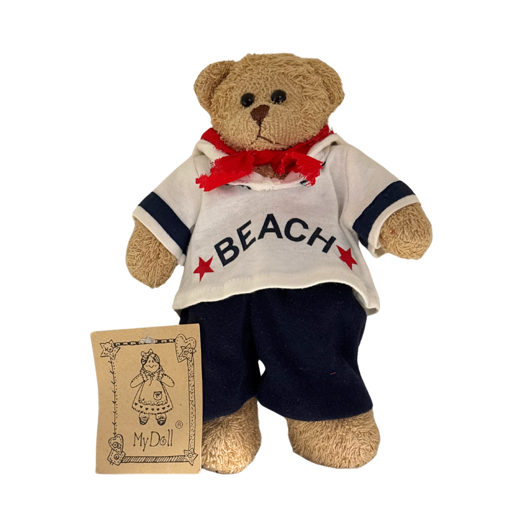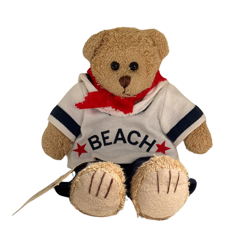 Un orsetto vestito con pantaloncini blu, casacca bianca con scritta beach e foulard rosso.