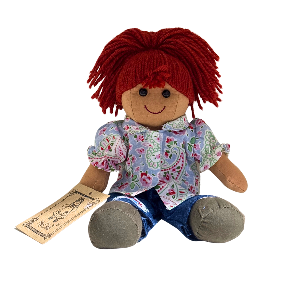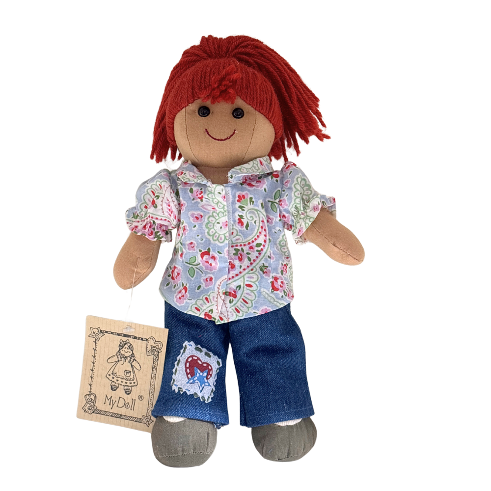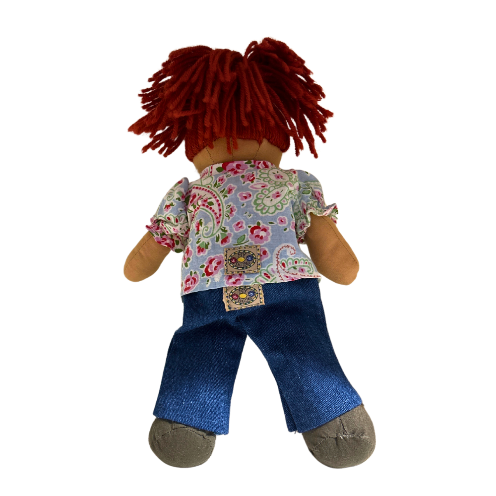 La bambola Veronique ha i capelli rossi, è vestita con una camicietta a fiori, un jeans con applicati il cuore e la stellina.