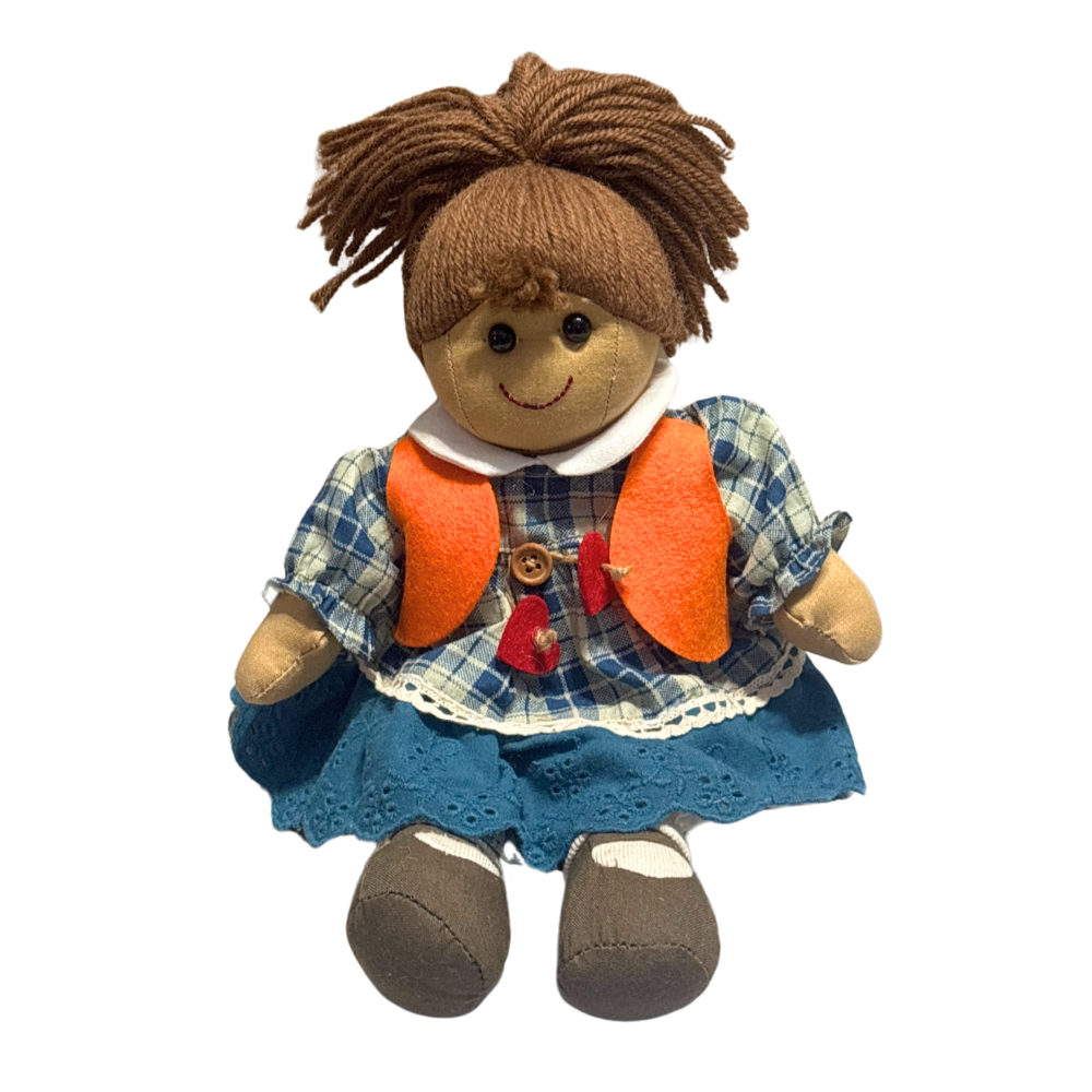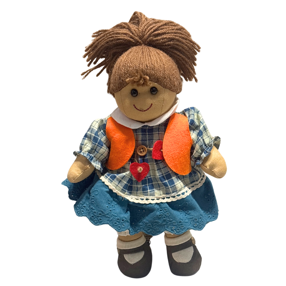 La bambola Jessica ha i capelli marroni, indossa un vestitino blu a righe con cuoricini, un gilet arancione e delle culotte a pois.