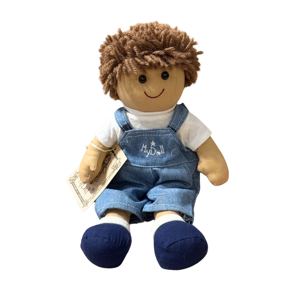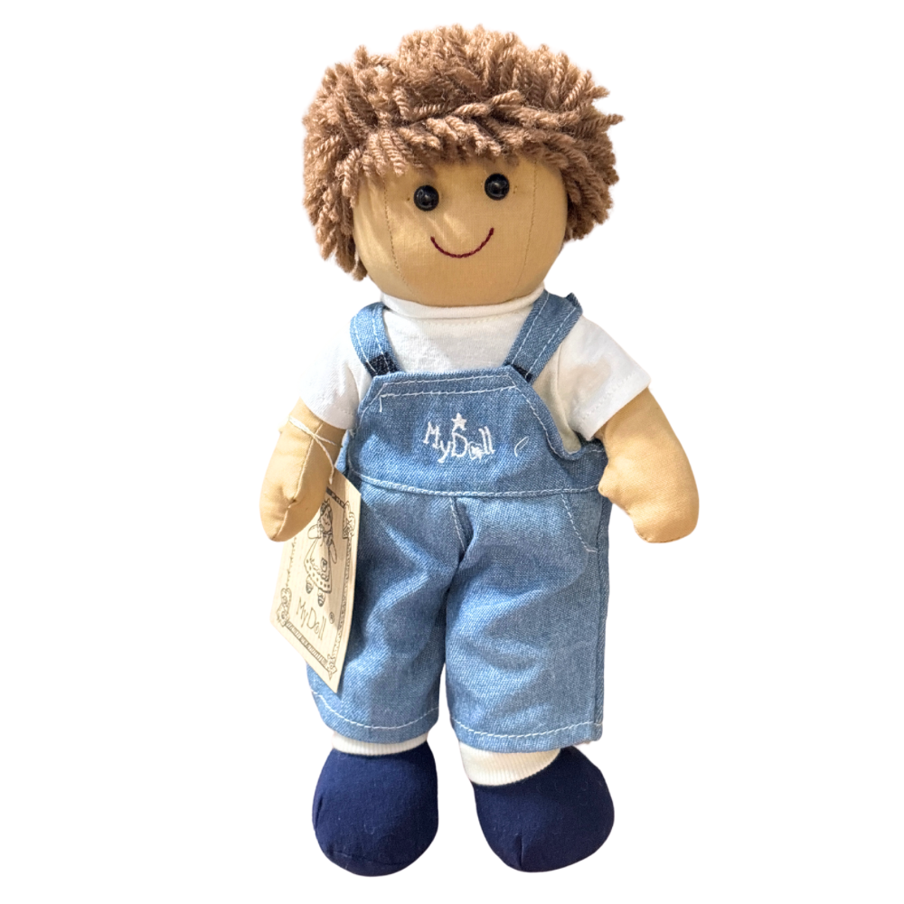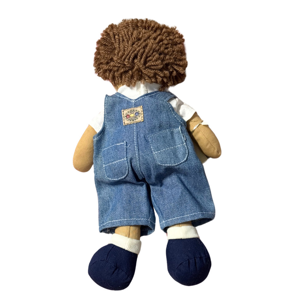 Il bambolo Daniel ha i capelli marroni, veste una salopette di jeans ed una maglietta a maniche corte bianca.