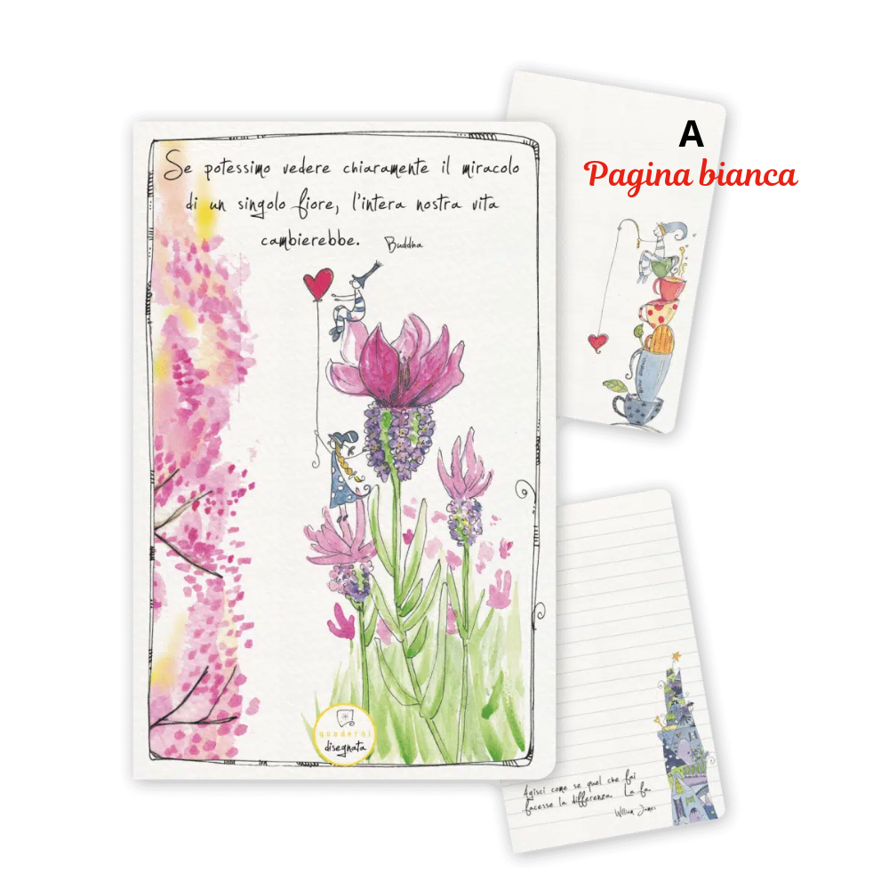 In copertina (carta ecologica martellata 250 grammi) due folletti, dei fiori alti e la frase di Buddha “Se potessimo vedere chiaramente il miracolo di un singolo fiore, l'intera nostra vita cambierebbe”, che ti ispira a cogliere la bellezza in ogni dettaglio.