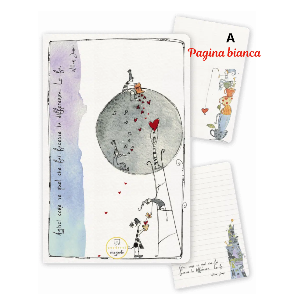 Quaderno con angoli arrotondati, illustrazioni ad acquerello ed aforismi, stampato in carta ecologica certificata, plastic free e 100% made in Italy. L'interno è composto da 44 pagine bianche o a righe in carta avorio 90 grammi.