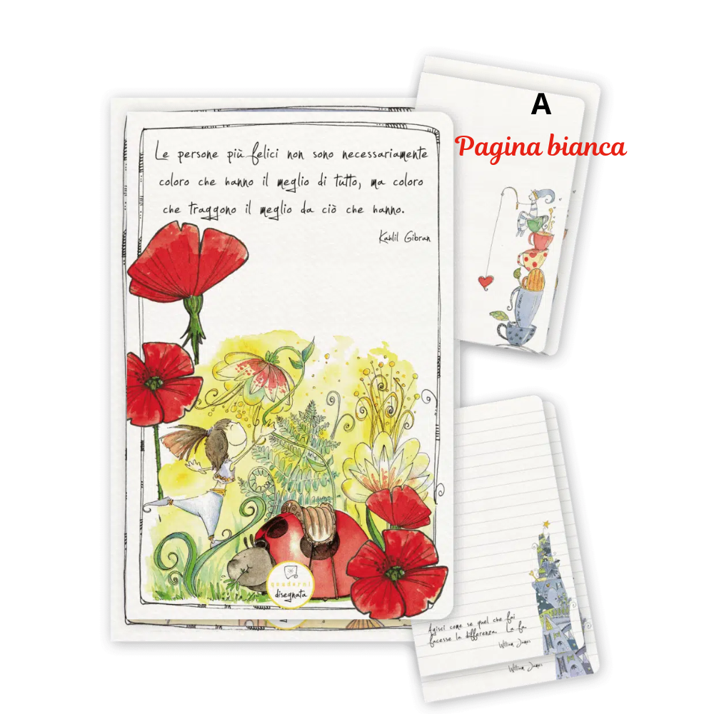 Quaderno con angoli arrotondati, illustrazioni ad acquerello ed aforismi, stampato in carta ecologica certificata, plastic free e 100% made in Italy. L'interno è composto da 44 pagine bianche o a righe in carta avorio 90 grammi.