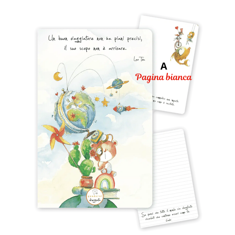 Quaderno con angoli arrotondati, illustrazioni ad acquerello ed aforismi, stampato in carta ecologica certificata, plastic free e 100% made in Italy. L'interno è composto da 44 pagine bianche o a righe in carta avorio 90 grammi.