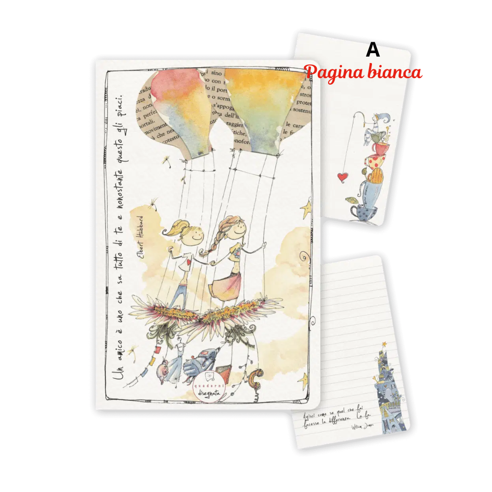In copertina (carta ecologica martellata 250 grammi) due amiche, due mongolfiere e la frase di Elbert Hubbard "Un amico è uno che sa tutto di te e nonostante tutto gli piaci.", dedicata fedeltà dell'all'amicizia.