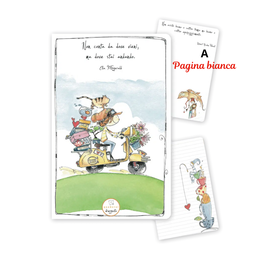 Quaderno con angoli arrotondati, illustrazioni ad acquerello ed aforismi, stampato in carta ecologica certificata, plastic free e 100% made in Italy. L'interno è composto da 44 pagine bianche o a righe in carta avorio 90 grammi.