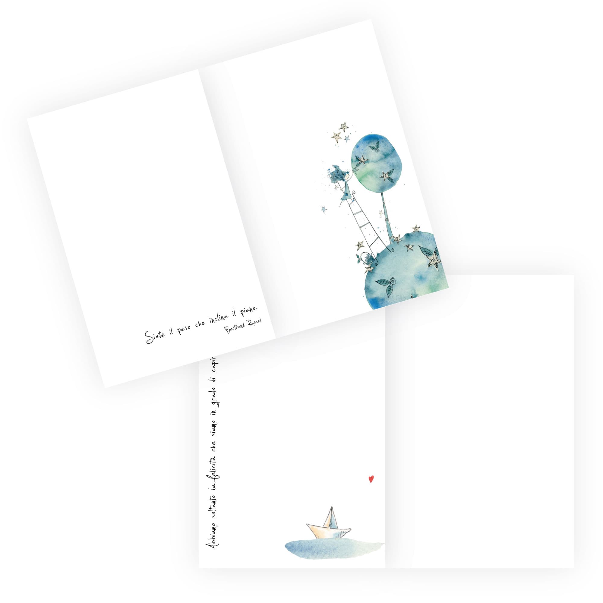 Quaderno con angoli arrotondati, illustrazioni ad acquerello ed aforismi, stampato in carta ecologica certificata, plastic free e 100% made in Italy. L'interno è composto da 44 pagine bianche o a righe in carta avorio 90 grammi.