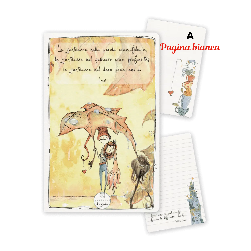 Quaderno con angoli arrotondati, illustrazioni ad acquerello ed aforismi, stampato in carta ecologica certificata, plastic free e 100% made in Italy. L'interno è composto da 44 pagine bianche o a righe in carta avorio 90 grammi.