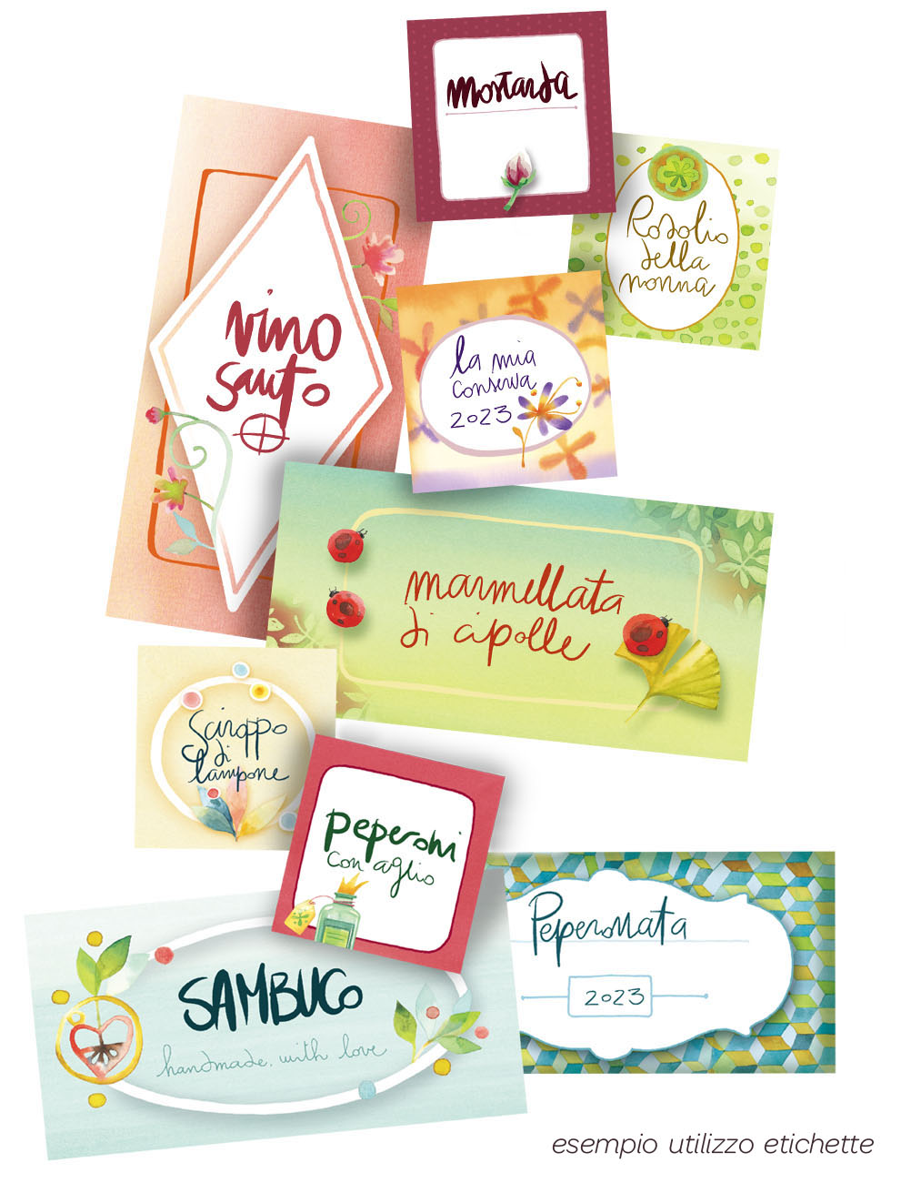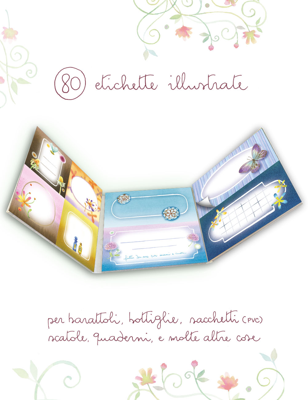 Per i vostri preziosi vasetti di marmellata, bottiglie di nocino, quaderni di storia, sacchettini di biscottini! Finalmente le etichette perfette per le vostre creazioni: uno splendido e pratico libretto a tre ante in sei versioni completamente diverse, contenente ben ottanta etichette adesive (quattro quadrate e quattro rettangolari, otto tinte e decorazioni). Alcune rettangolari sono pensate per essere usate in verticale, rispettando così il formato delle piccole bottiglie. Scatenatevi con l’handmade, e divertitevi ad impreziosirlo con queste etichette, scegliendo quelle perfette per le vostre produzioni da regalare o da mettere in dispensa.