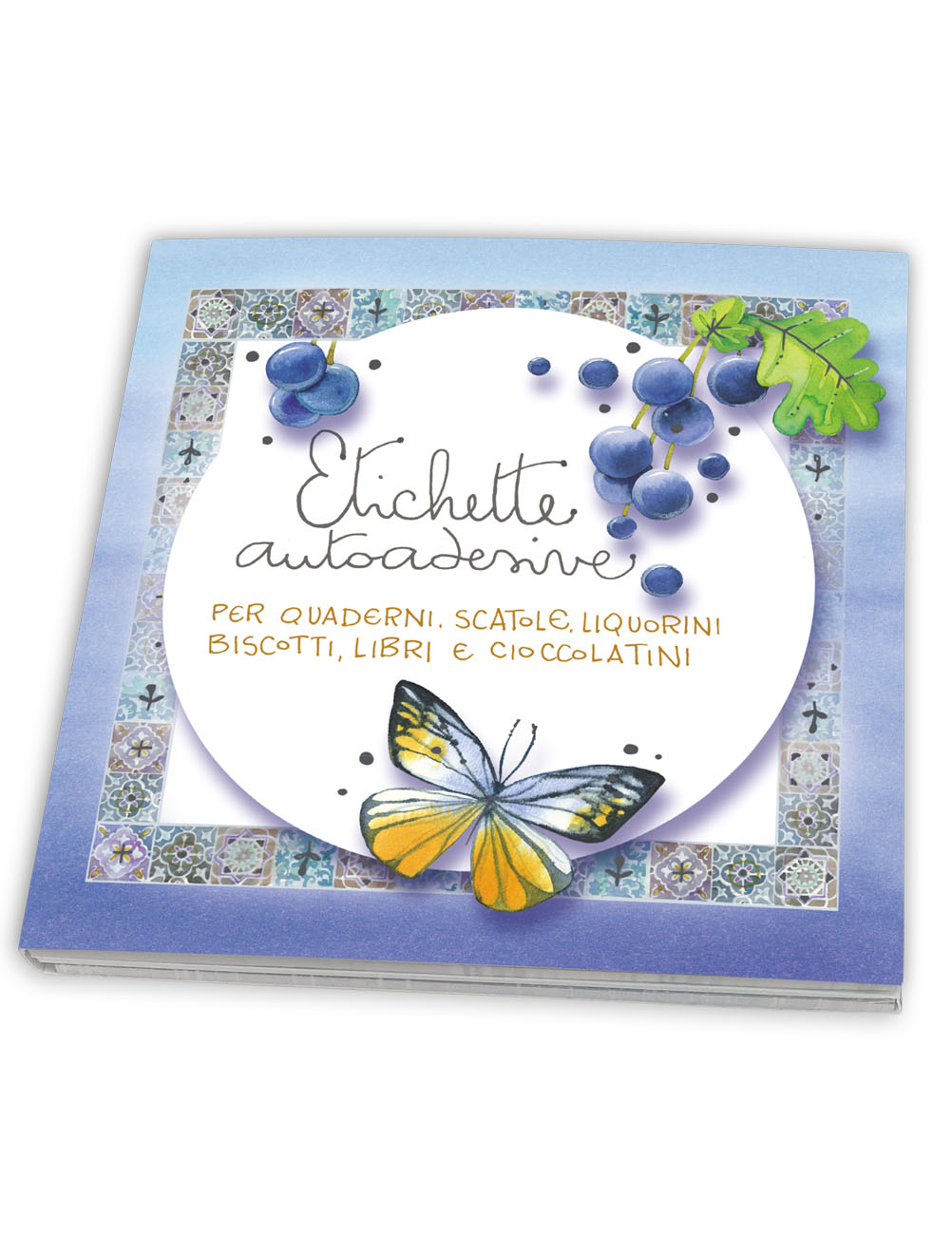 Confezione color indaco con farfalla contenente delle Etichette autoadesive per cose buone e belle, per il tuo handmade, fatte proprio per te, illustrate, per quaderni, scatole, liquorini, per le tue cose belle e buone.