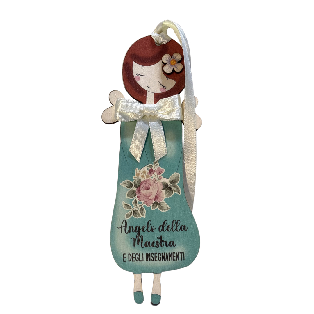 Angelo della Maestra e degli insegnamenti verde in legno con nastrino coordinato per appenderlo.