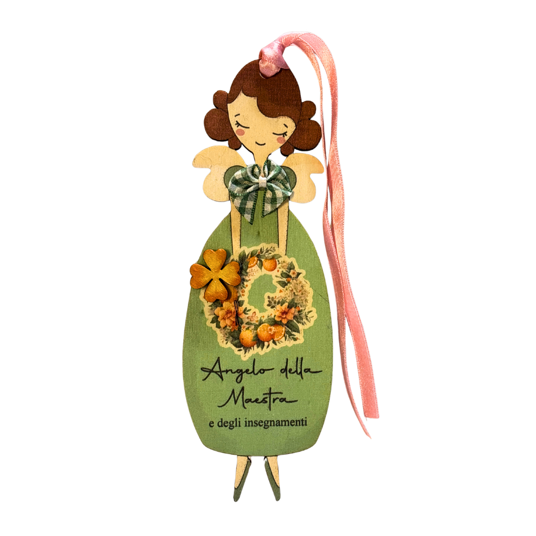 Angelo della Maestra e degli insegnamenti verde in legno con nastrino coordinato per appenderlo.
