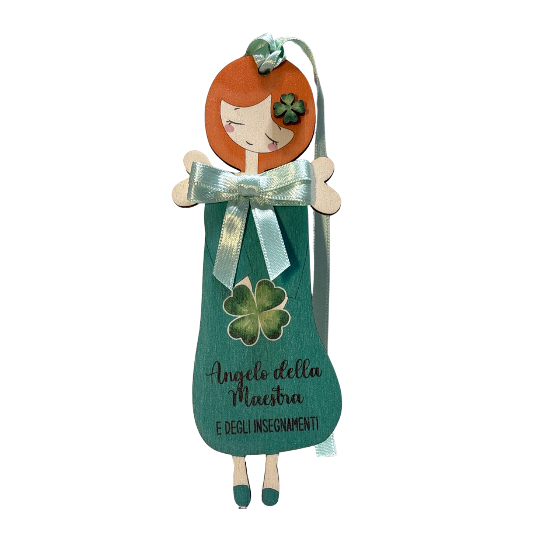 Angelo della Maestra e degli insegnamenti verde in legno con nastrino coordinato per appenderlo.