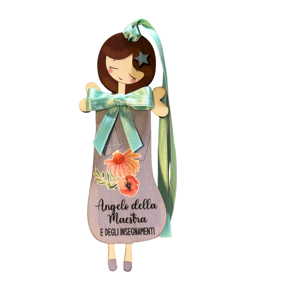 Angelo della Maestra e degli insegnamenti grigio in legno con nastrino coordinato per appenderlo.
