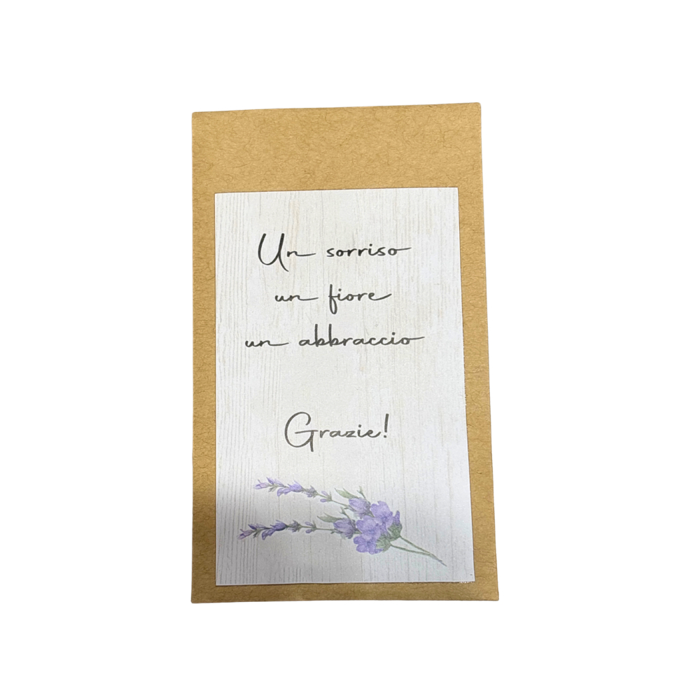 Bustina di semi con frase emozionale "Un sorriso un fiore un abbraccio Grazie!".